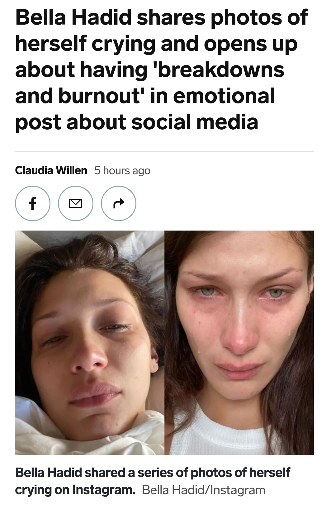 As a commoner, I have no idea that Bella Hadid is also crying like the rest of us. I honestly think it’s impossible something sad happens to Bella Hadid, she is the most beautiful girl in the planet Earth, she has everything, her name resonance with all beautiful things. But, the picture above says it all, Bella Hadid is feeling insecure, has breakdowns, and burnouts too…
