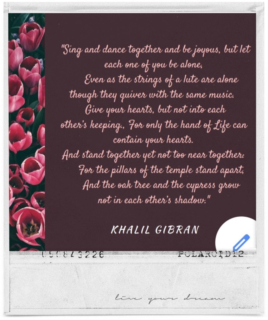 Both of those poems sing about love, a simple but deep love. Khalil reminds us that being a couple is not necessarily being similar in every way, a couple is made from two different human being, but the differences will dance in one harmonious love song ( even as the string of a lute are alone though they quiver with the same music). While Sapardi talk about a giving love, an endless love, loyalty and kindness between lovers.