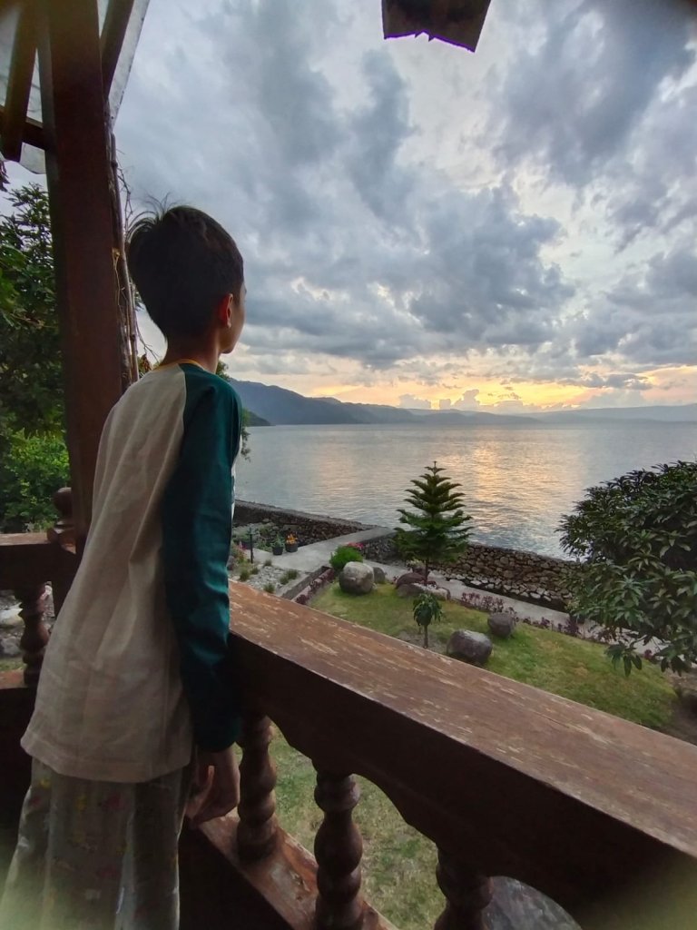 I miss this place, it’s Lake Toba seen from a nice hotel of Pondok berata dap dap in Balige, North Sumatra, Indonesia. It’s my son looking out to the lake.